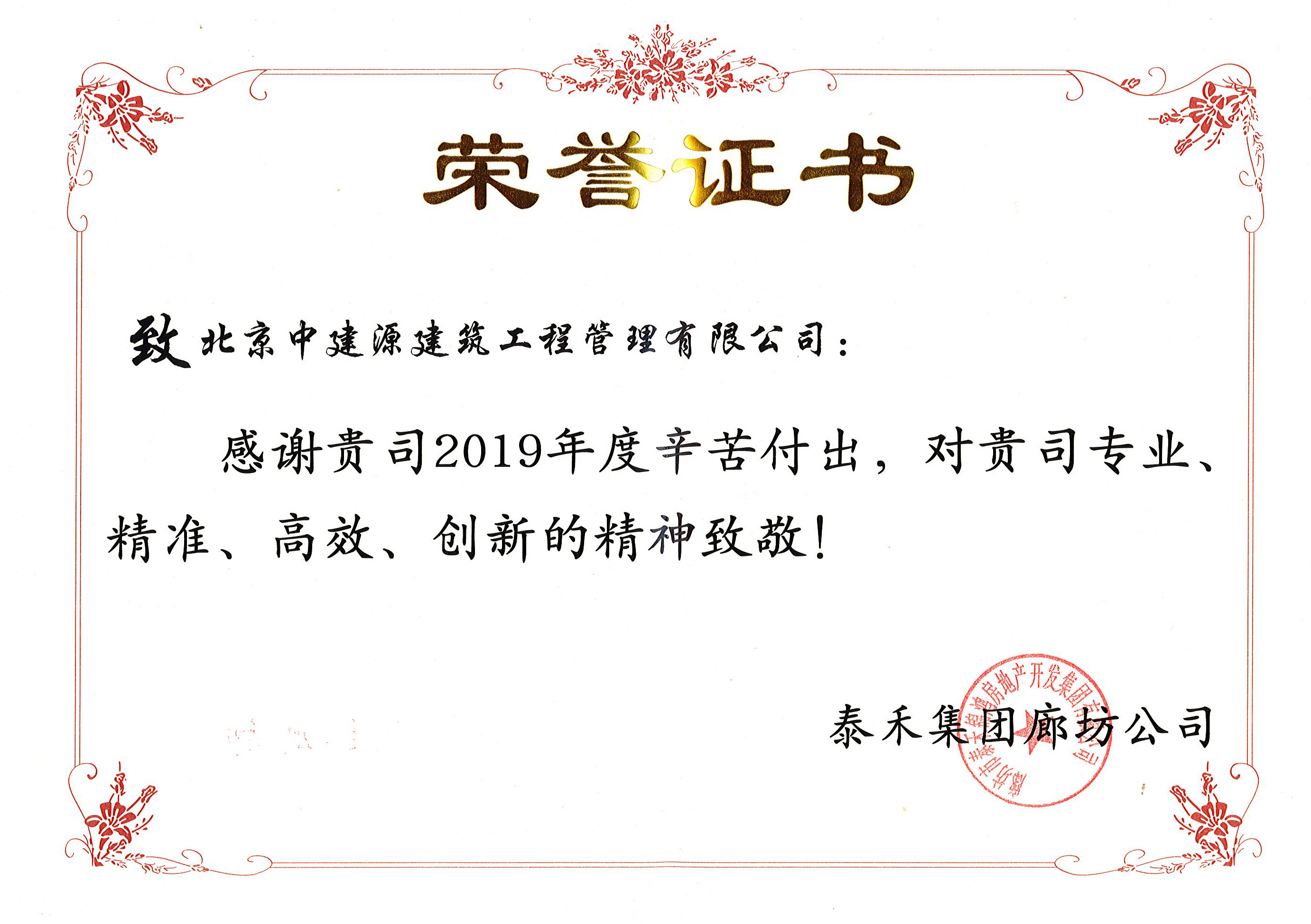 2019年的最后一天,北京的天氣雖然格外的寒冷,但是中建源人的心情異常的溫暖。因為就在今天,中建源公司收到業主泰禾集團廊坊公司授予我司的榮譽證書。