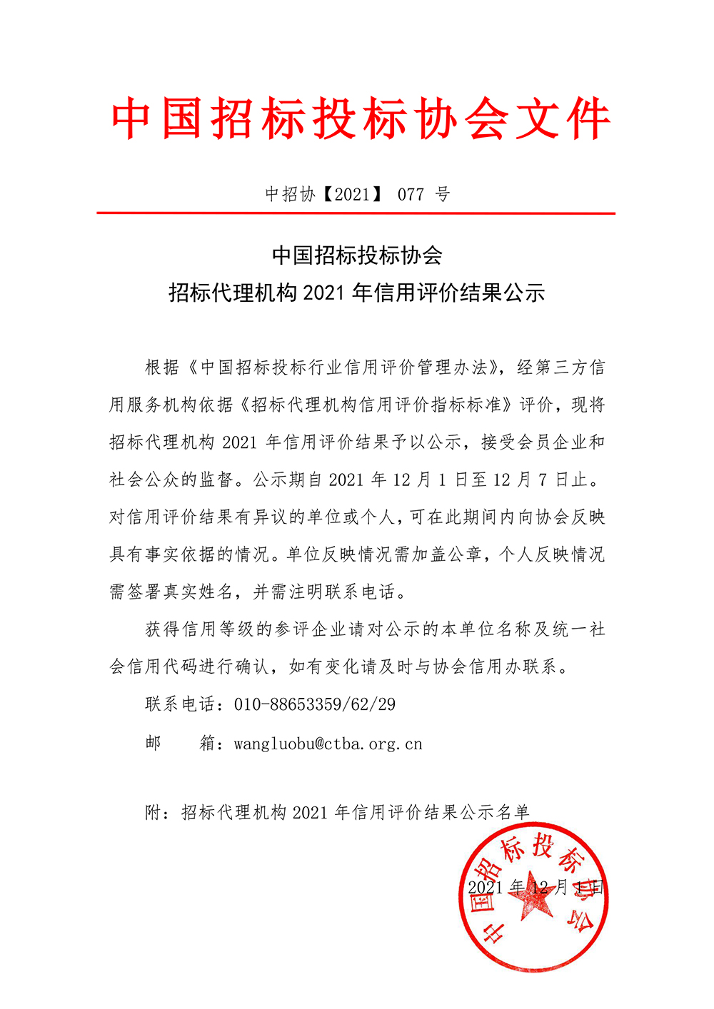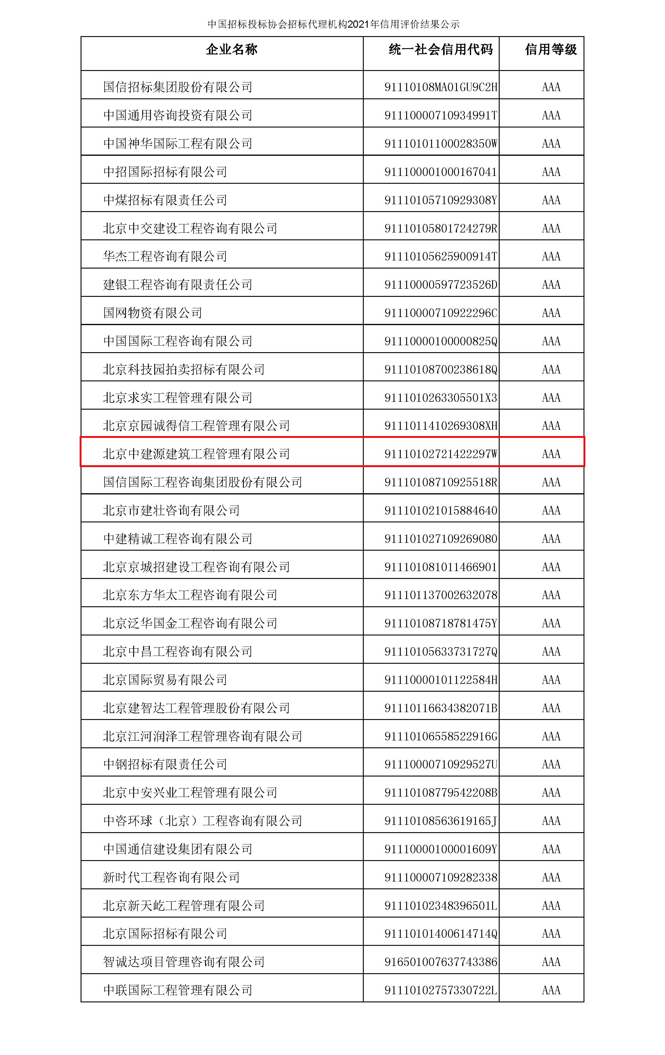中國招標投標協會招標代理機構2021年信用評價結果公示