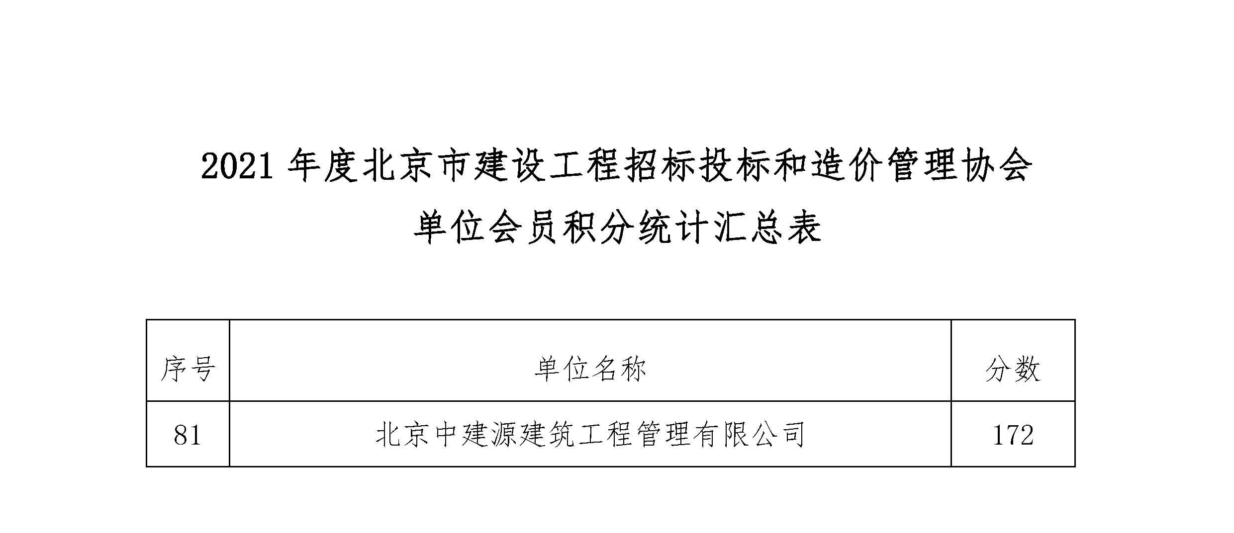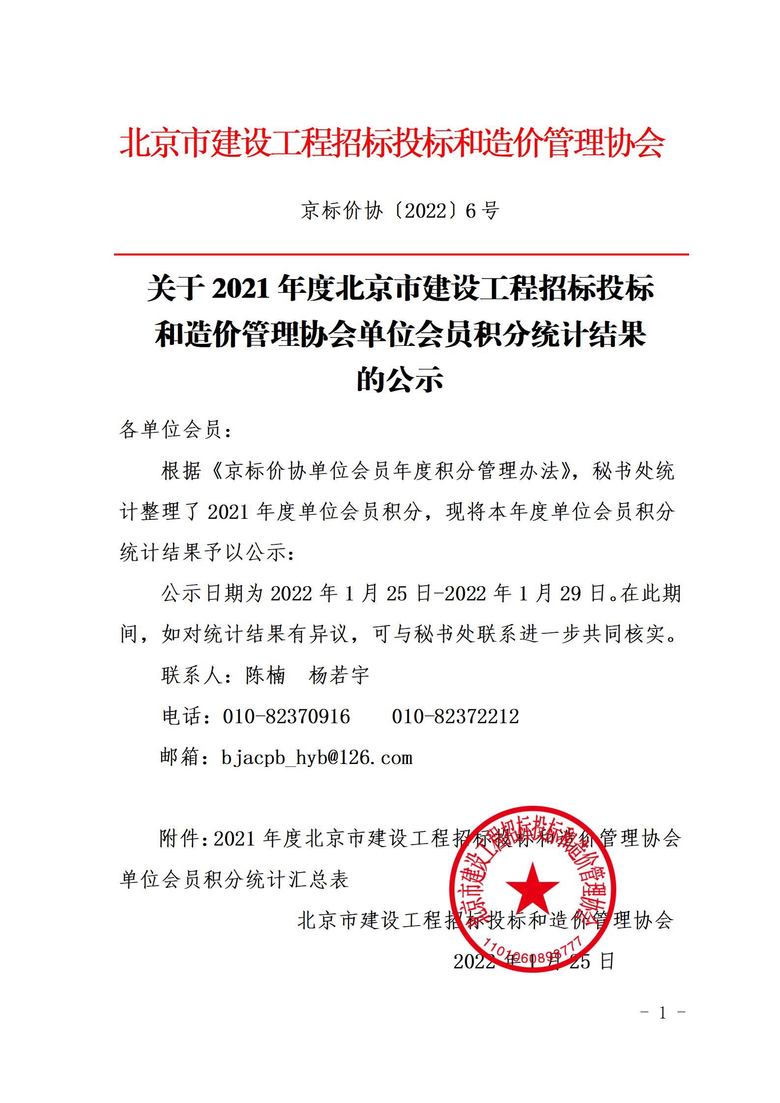 關于2021年度北京市建設工程招標投標和造價管理協會單位會員積分統計結果的公示